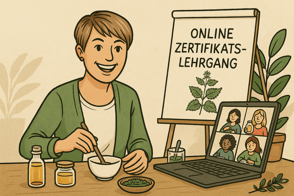 Nur das Format. Inhalte, Dauer & Preis sind identisch. Beim Online-Lehrgang erhältst du Goodie Bag + Modul-Päckchen, Live-Termine, Aufzeichnungen & gefilmte Kräuterwanderungen.
